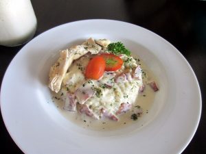 ½ cawan susu tepung Fernleaf Full Cream, hirisan ayam, keju cheddar, cendawan butang (dihiris nipis), bawang Holland, serbuk lada hitam, garam secukup rasa, 2 sudu tepung gandum, ½ cawan air, sedikit minyak.