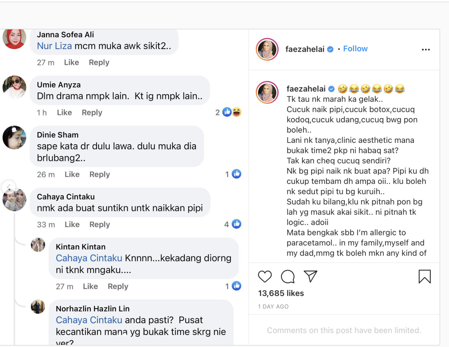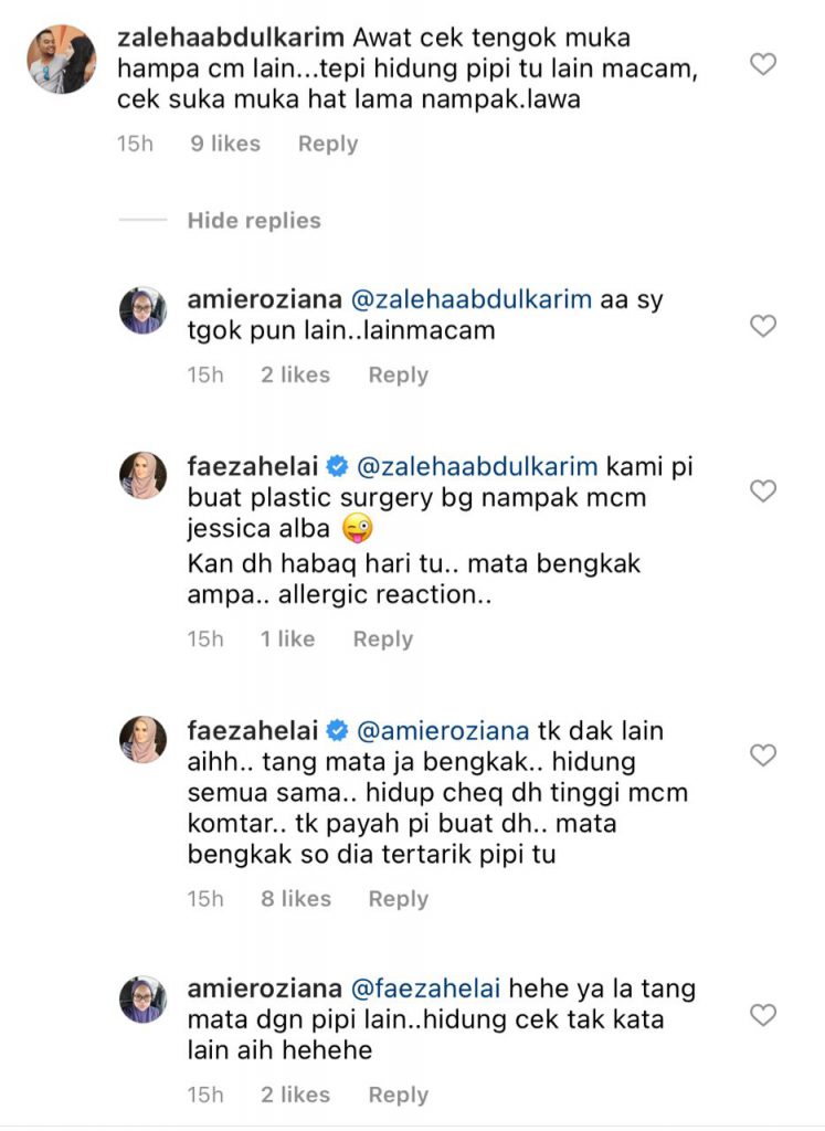 “knape muka u nampak bengkak2 .. @faezahelai ..i suka tengok u mcam sblom ni.. Cantik sgat,” tulis lagi seorang warganet.