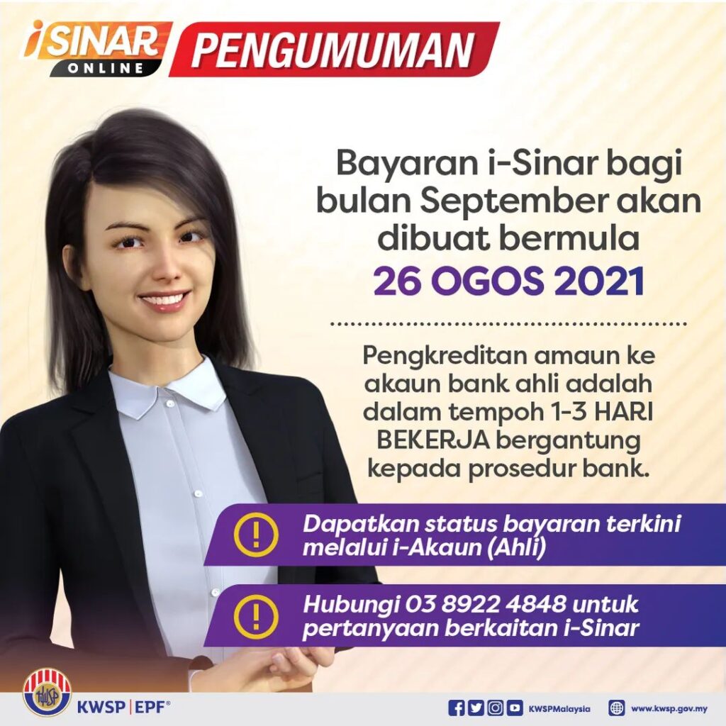 Berikut adalah makluman tarikh anggaran bayaran i-Sinar KWSP bagi bulan September 2021 dan cara membuat semakan melalui i-Akaun.