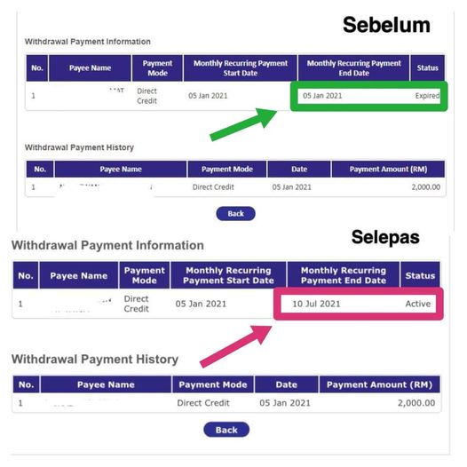 Bagi yang telah membuat pindaan amaun, (contohnya, sebelum ni akaun dah e.xpired sebab KWSP dah bayar habis dah jumlah yang dipohon) nanti bila buat pindaan, akaun kembali berstatus Active dan ada R.ecurring Date sampai ke tarikh akhir bayaran yang akan dibuat.