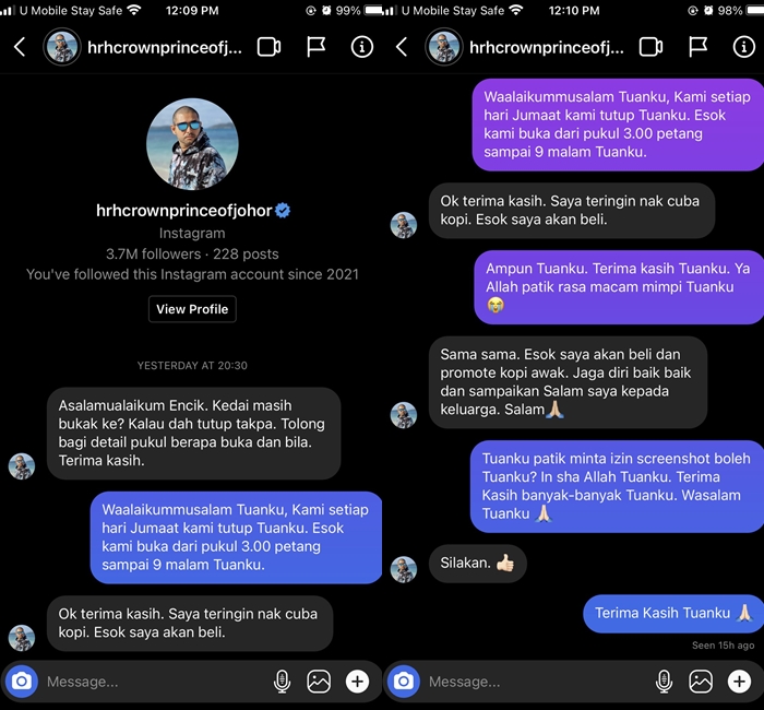 Menerusi laman Twitter, pemilik perniagaan yang dikenali sebagai Jong Razali itu berkongsi tangkap layar perbualan di akaun Instagram milik gerainya bersama Tunku Mahkota Johor, Tunku Ismail Sultan Ibrahim (TMJ).