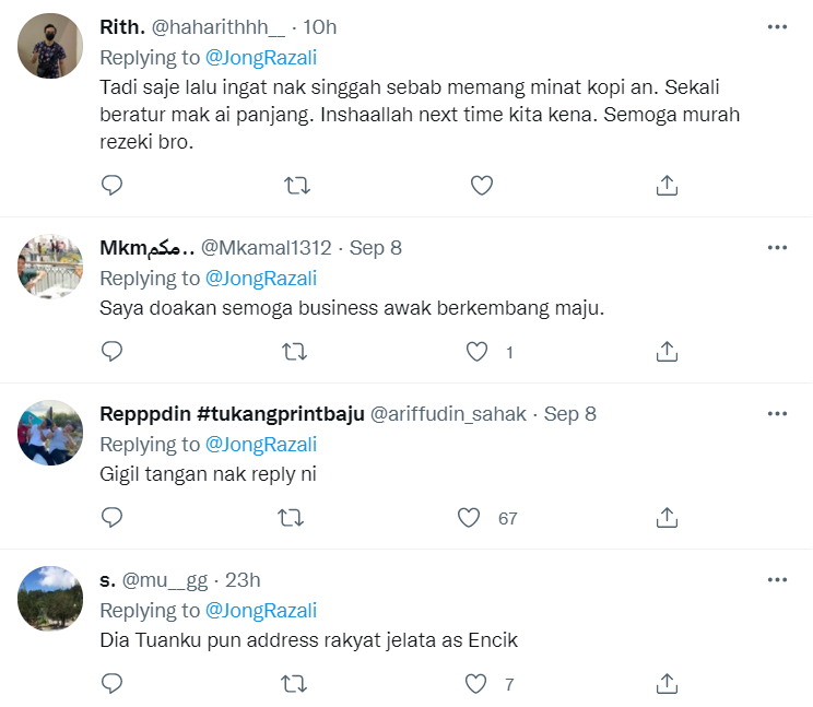 Rata-rata pengguna laman sosial mendoakan kemurahan rezeki Jong Razali dan ada juga yang turut ingin mencuba kopi yang dijual di gerai Kopi Rakyat.